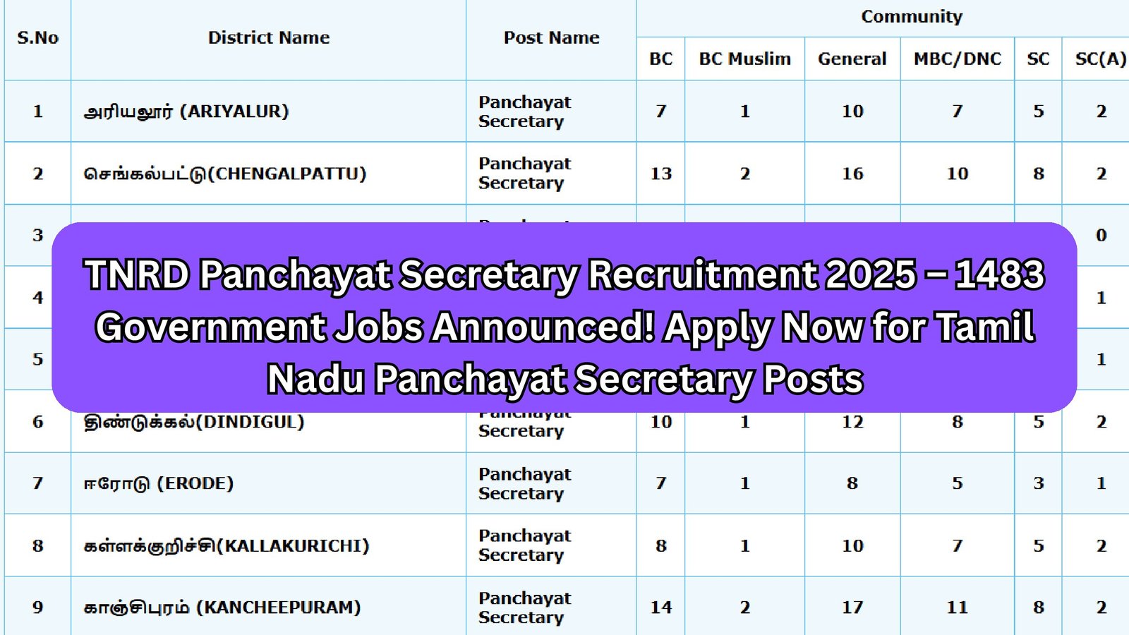 TNRD Panchayat Secretary Recruitment 2025 – District-Wise Vacancy List for 1483 Posts in Tamil Nadu